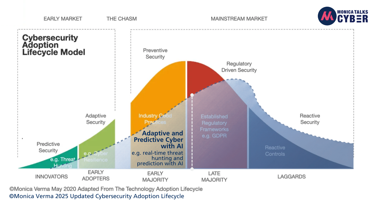 Having said that, adaptive security is not enough. I said that 5 years ago. My model showcased that the next wave of cybersecurity adoption in the market and maturity in the organisations wonât just be adaptability but predictive security e.g. predicting and defending against threats in real-time, e.g. threat hunting in real-time, etc. It was true back then in terms of where we were heading. Itâs truer today, especially with AI. Let me explain.